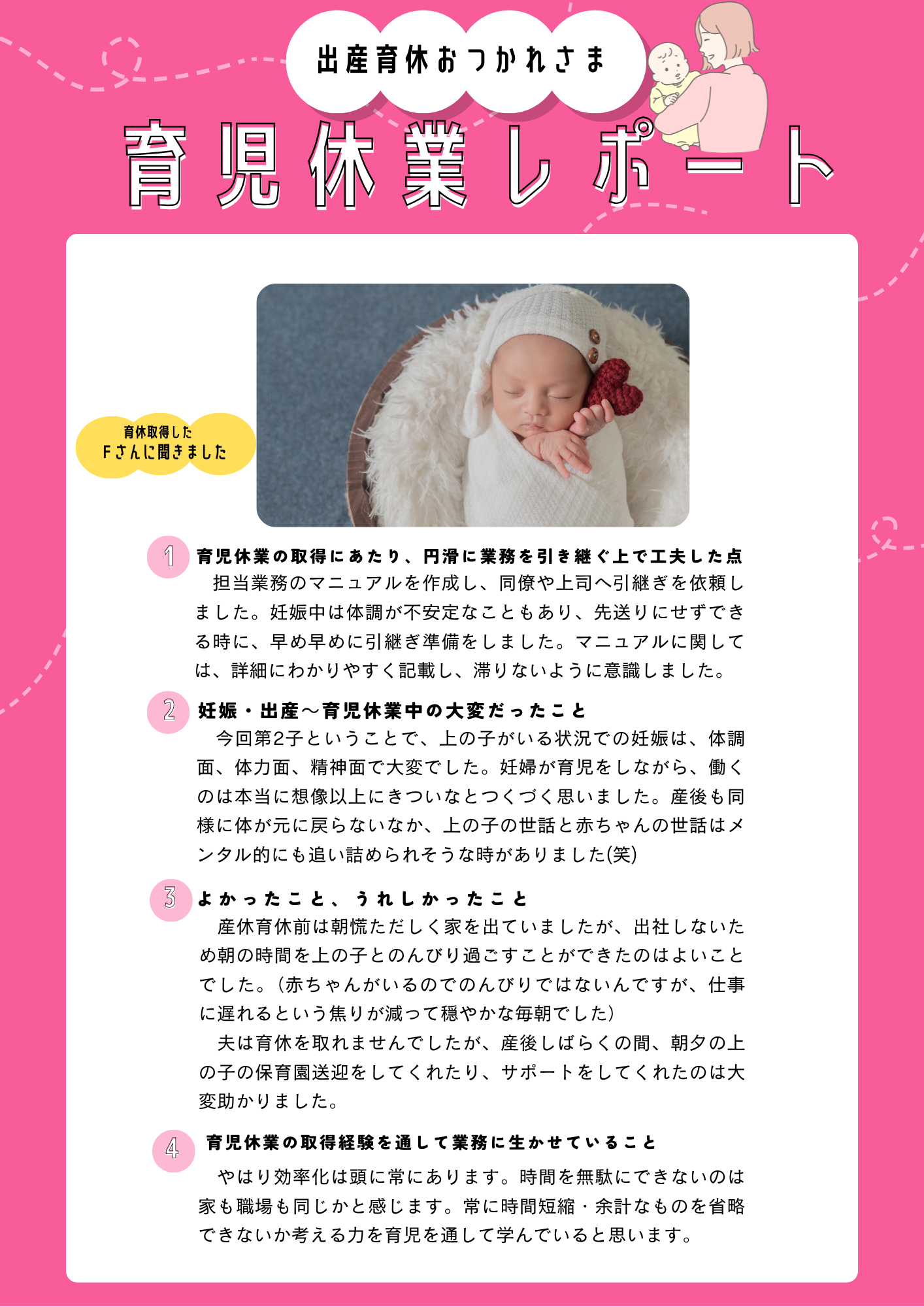 Fさん、お子様のご誕生おめでとうございます!出産・育休、お疲れ様でした。