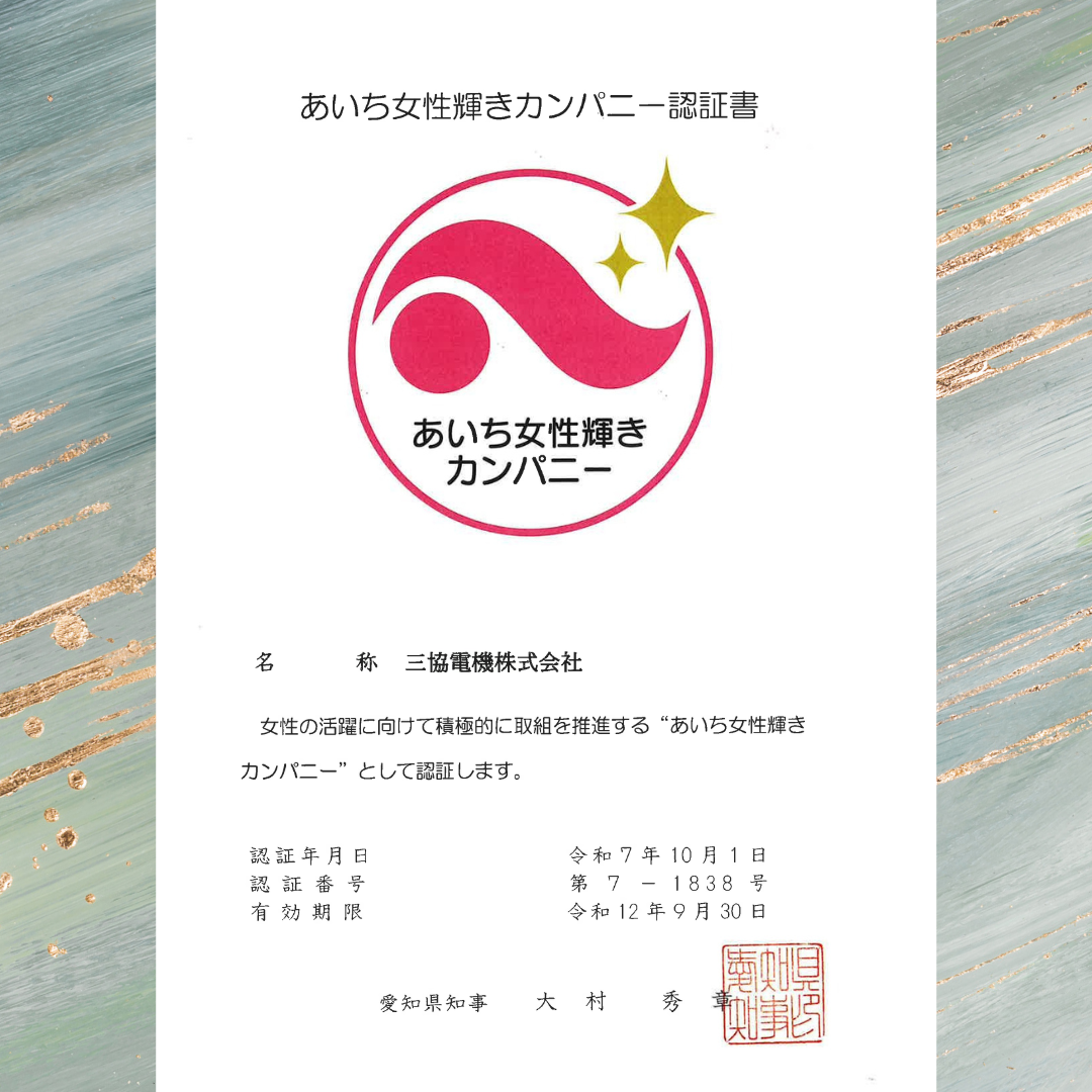 三協電機株式会社は、愛知県より2025年10月1日付で「あいち女性輝きカンパニー」として認証されました🎉 この制度は、女性の活躍を積極的に推進する企業を愛知県が認証するもので、採用・育成・職 […]